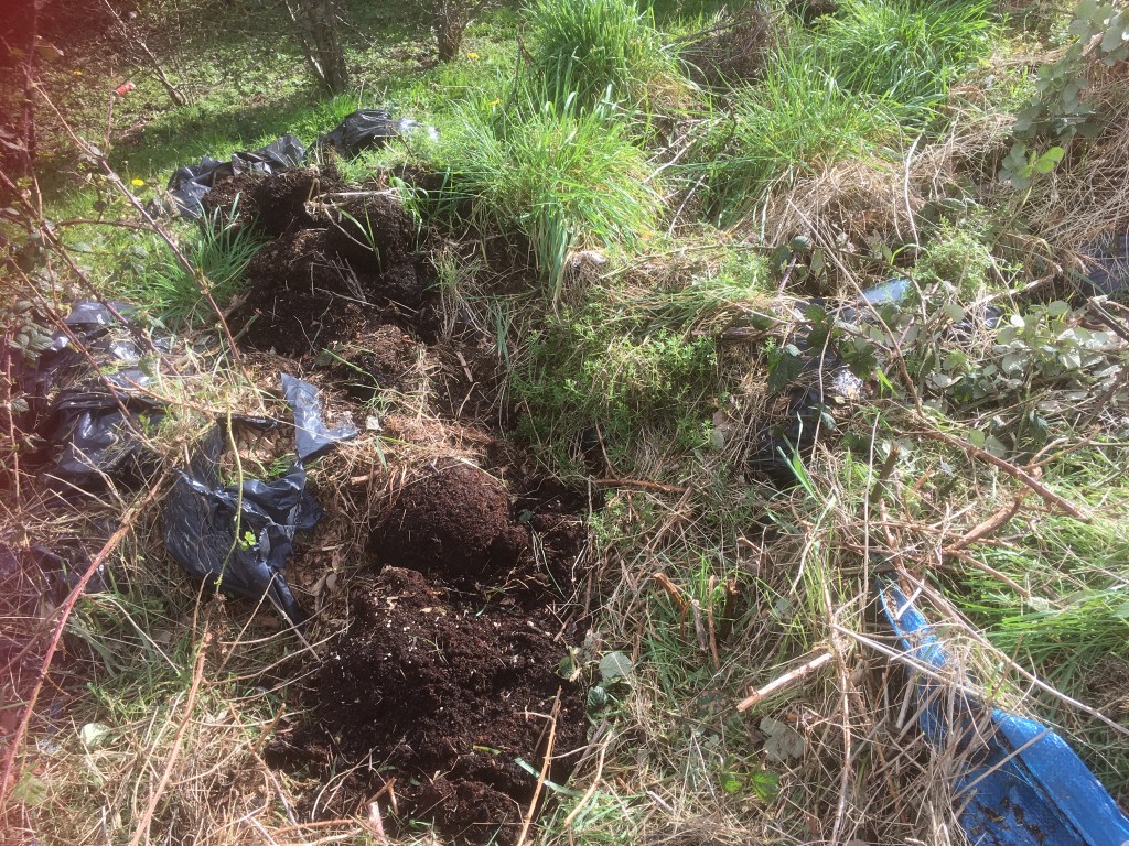 As I began to tackle the dumpy hinterland I realised that brambles were a tough bunch. My work became archaeological as I worked down through layers of weed suppression and dumping. The top layer, the blue tarpaulin, was possibly the worst to deal with. The brambles had pushed their way through and trying to get them out shredded the tarpaulin leaving strands of blue plastic that needed to be carefully picked out of the soil. The next layer was a patchwork of old carpet and black fabric anti-weed mat. The weed mat was easy to take out, the carpet needed to be cut into sections around the brambles (yes they pushed through that) in order to remove it. Work was paused whilst I consulted with a friend, who is an expert in wiggly wild things, as I found a slowworm living under one of the carpet pieces. Her advice to transfer carpet and slowworm to a safe place was carried t out and work resumed. Fortunately my dog, Mavis, never spotted any slowworms – she is terrified of snakes and once panicked on seeing a particularly large worm!
